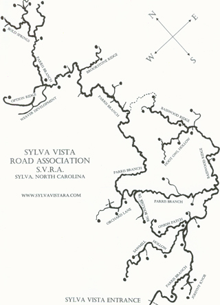 This map was prepared by Emory Prescott and shows the general layout of roads and houses in the Sylva Vista vicinity.